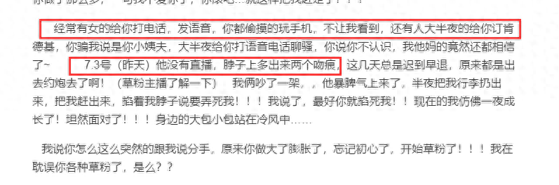 时间来到7月5日这天,无双当日没有直播。回到到家以后,女方发现“渣男”无双的脖子上竟然出现了两个吻痕,