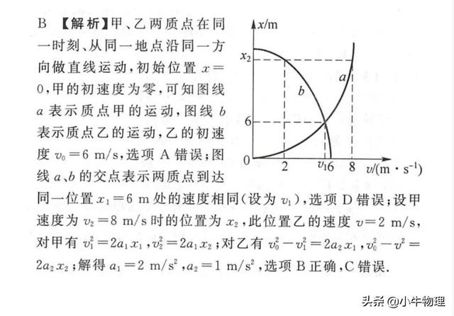 例题:甲、乙两质点在同一时刻、从同一地点沿同一方向做直线运动.质点甲做初速度为零、加速度大小为a₁的匀加速直线运动,质点乙做初速度为v₀、加速度大小为a₂的匀减速直线运动,当速度减为零后保持静止.甲、乙两质点在运动过程中的x-v(位置一速度)图像如图所示,虚线与对应的坐标轴垂直,则()