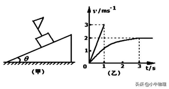 在倾角为θ=30°的长斜面上有一带风帆的滑块从静止开始沿斜面下滑,滑块的质量为m=2kg,它与斜面的动摩擦因数为μ,帆受到的空气阻力与滑块下滑的速度成正比,即f=kv.若从静止开始下滑的速度图像如图中的曲线所示,图中的直线是t=0时速度图像的切线,g=10m/s².