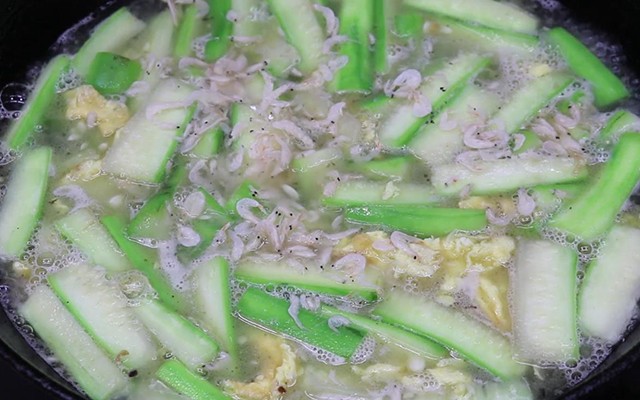 第四步:往锅中倒入开水,再加入炒过的丝瓜,用勺子稍加搅拌,然后放入一把虾皮增鲜。
