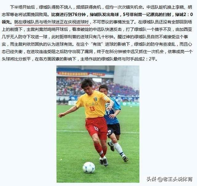 面对这样一个进球,浙江绿城的球员自然不能愿意。不过绿城球员的抗议没有改变比分,最终中远打入第二球,领头羊痛失3分。关于主裁判张宝华的判决是否合适,至今足协没有给出个结论。根据足球运动的规则,在球被踢出前,每个队员都应在本方半场内,开球队的对方队员还应当保持距球不少于9.15米。当时绿城球迷提供了视频,不过因为清晰度不够,足协没有采纳。