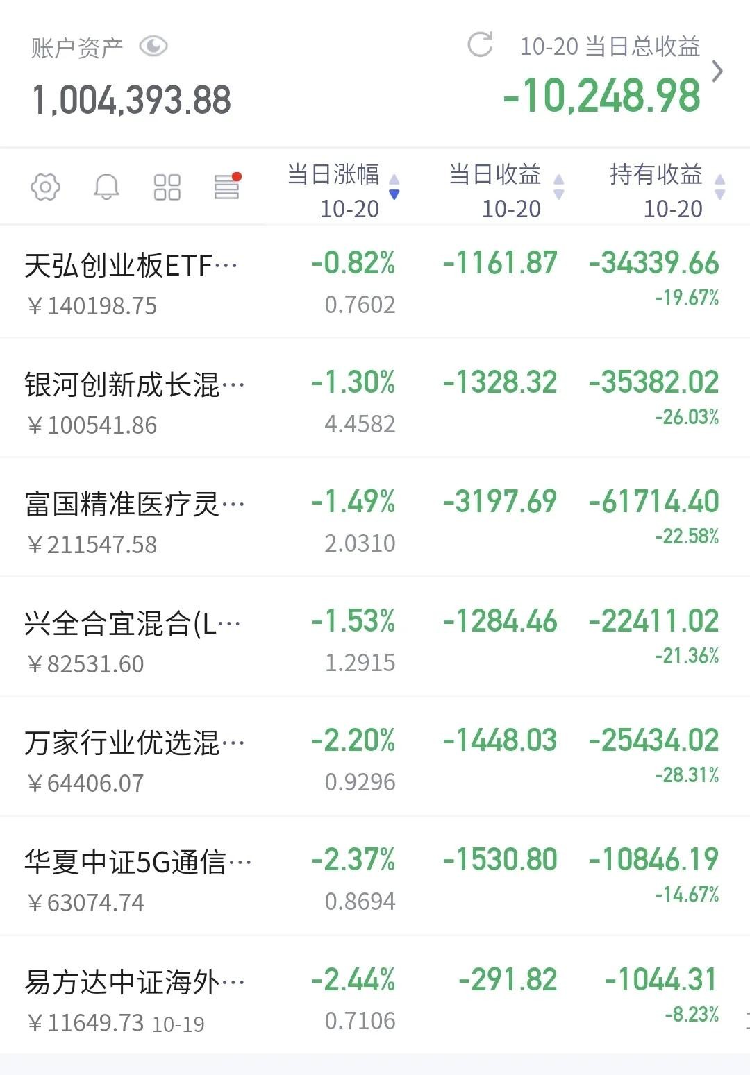 持有基金昨天更新的情况,见上面的截图,昨天亏损10295元。