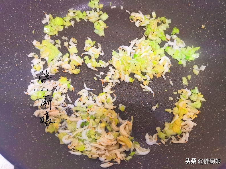②起锅开火,锅热之后倒入适量食用油,我倒了2小汤勺,稍热一点后放入葱姜和虾皮,小火翻炒出香。