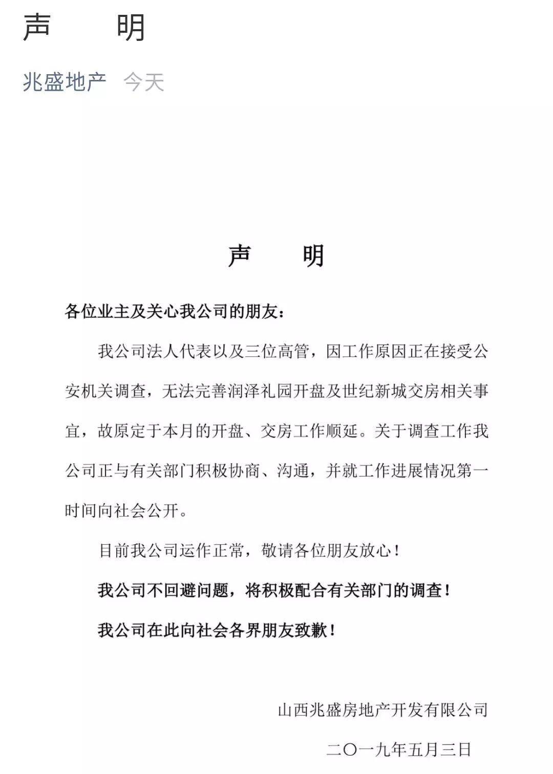 2019年5月3日,长治兆盛地产就“因法人陈兆平等人接受公安机关调查,无法完善润泽礼园(欧亚小镇)开盘及世纪新城交房相关事宜”发布声明!