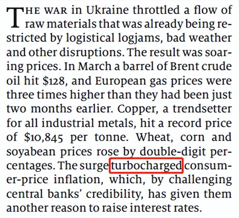 乌克兰战争抑制了已经受到物流堵塞、恶劣天气和其他干扰限制的原材料供应,其结果是原材料的价格飞涨。今年3月,布伦特原油达到每桶128美元,欧洲天然气价格比两个月前高出三倍。作为所有工业金属的引领者,铜的价格创下了每吨10845美元的纪录。小麦、玉米和大豆价格涨幅达到两位数。该涨幅推动了消费物价通胀,通过挑战央行的信誉,消费物价通胀又给了央行另一个加息的理由。