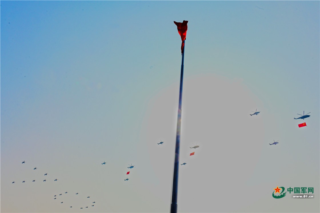这是空中护旗方队及组成“70”字样的直升机飞过天安门广场上空。尹威华摄