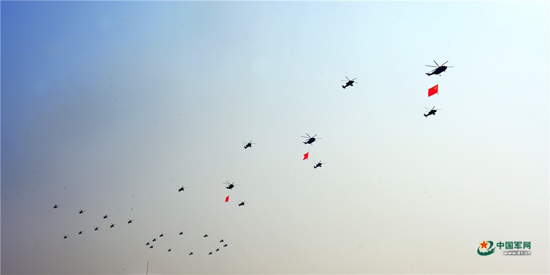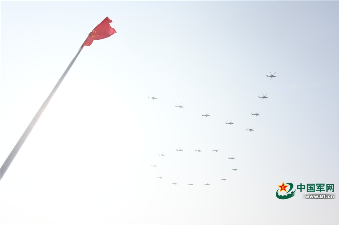 这是组成“70”字样的直升机飞过天安门广场上空。尹威华摄
