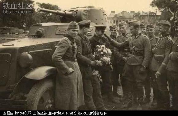 德军给苏军献花呢!貌似在说“欢迎、欢迎,热烈欢迎”,毕竟德军比苏军先攻入波兰。