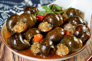田螺酿是一道十分有特色的美食,选用田螺把螺肉挖出,然后剁碎加入肉末、香菜等制作成馅料,酿入到田螺壳里。烹饪后的田螺酿香味扑鼻,味道鲜美,独具特色。