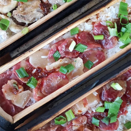 竹筒饭是少数民族的特色饮食,制作方式原始,原料考究。把糯米、腊肉、木耳、干笋等食材放入到竹筒里,然后将米饭烧熟而成。做好的竹筒饭清香味四溢,口感松软,味道丰富,滋味鲜美,让人吃得过瘾。