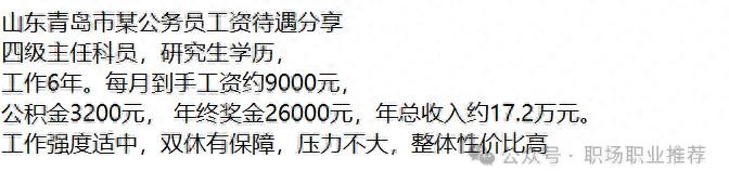 再来说说发展前景。像老哥这样有硕士学历、又肯干实干的年轻干部,只要不出差错,再熬个几年,提副处级应该没啥问题。到那个时候,收入待遇和管理权限都会有显著提升。从这个角度说,在青岛当公务员性价比还是很高的,既有稳定的收入保障,又有可期的发展空间。
