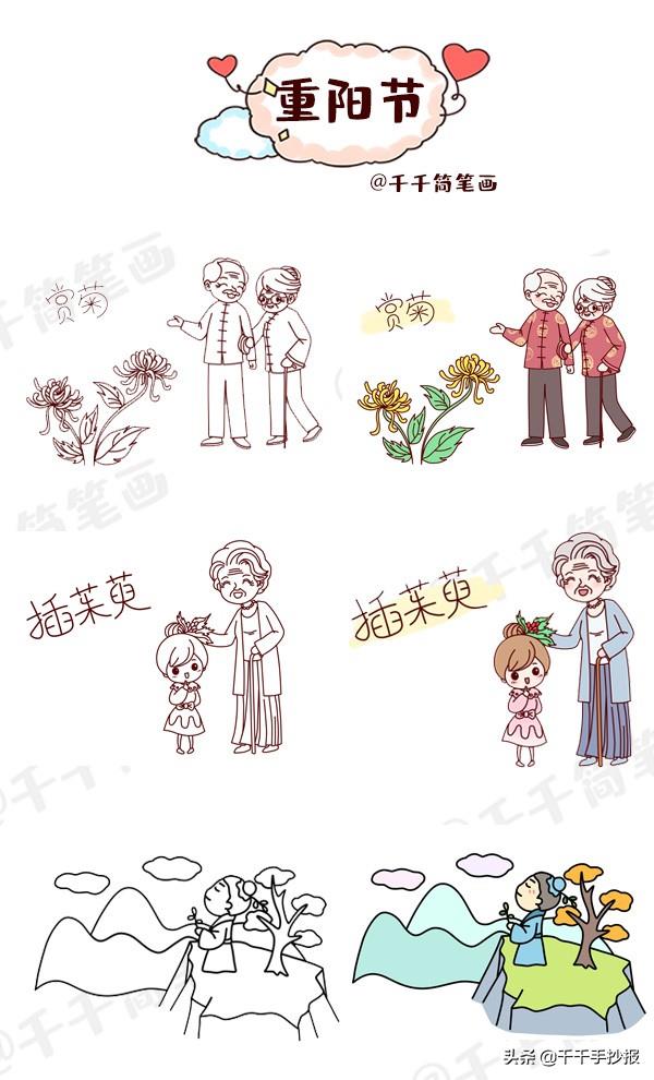 重阳节简笔画,赏菊、插茱萸、登高望远是重阳节的习俗