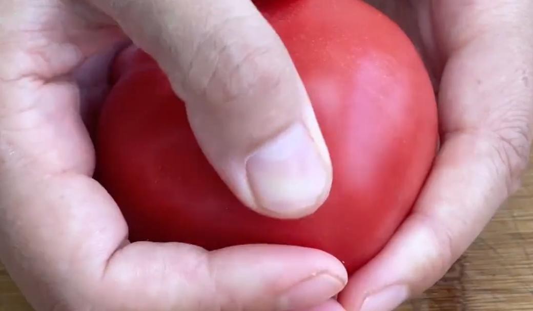 第三种方法,不需要借助任何的工具,我们的双手就可以将西红柿拿在手上,用大拇指这样去搓西红柿的皮,就把西红柿表皮搓到可以轻易的起皱就可以了,现在西红柿拿在手上就是软软的感觉。