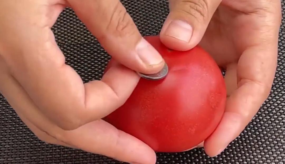 第二个方法,这个方法很简单,一样的先把西红柿根蒂去掉,取一个硬币在西红柿的表皮不停的刮蹭,要稍微用力一点,从上往下砸去刮。在用硬币刮西红柿的时候,我们要均匀一点,确保每一个面都能够被刮到,这样去皮的时候才容易剥皮。这个方法也可以用家里的勺子来刮,选择边缘窄一些的来刮,一直刮到西红柿变软且颜色加深的时候就可以了,每个面都刮好。