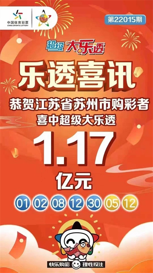 另外,根据江苏体彩网网站统计,本期苏州中出的这一注1.17亿元巨奖,是体育彩票大乐透今年开出的首个亿元大奖,也是大乐透历史上开出的第21个亿元大奖。
