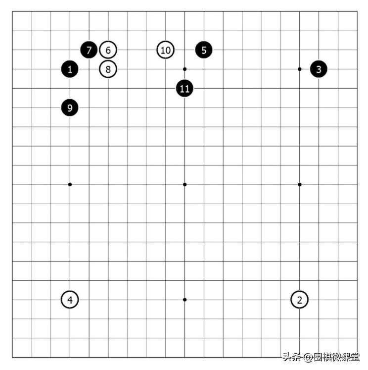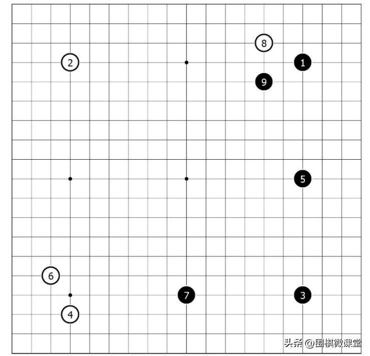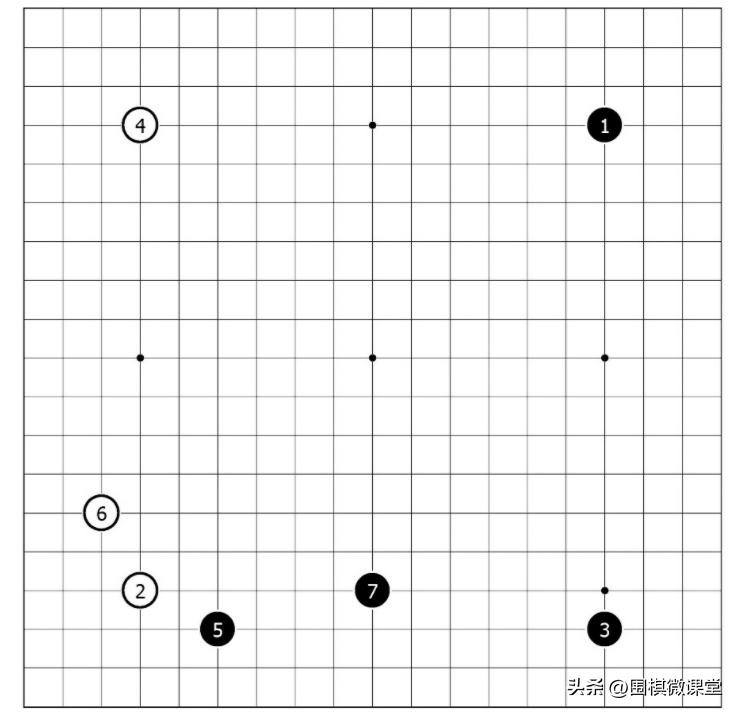 图1中,黑棋为三连星布局。前三手便把角星和边星连片,位于四路线上,意在取势。