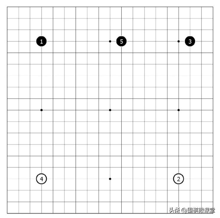 如图5,黑棋1、3、5的布局就是中国流布局。黑5没有选择守角,而是在边上连片,3颗棋子有机联系形成一个作战整体。