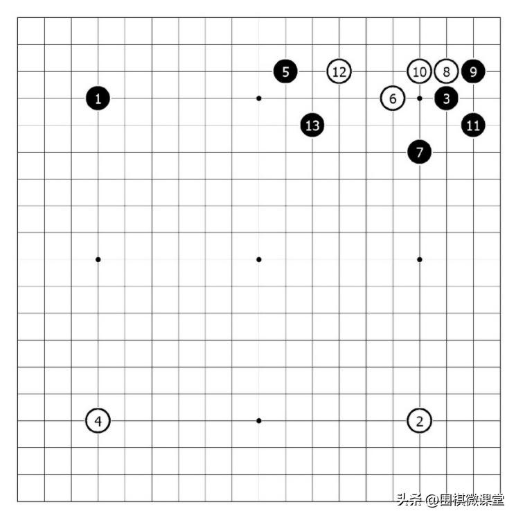 而图7中,白6如果从右上方侵入,则黑7小飞应对。和前面的情况类似,由于黑5的存在,白12只能委屈地拆一,被黑13飞攻过来,白棋就非常被动了。