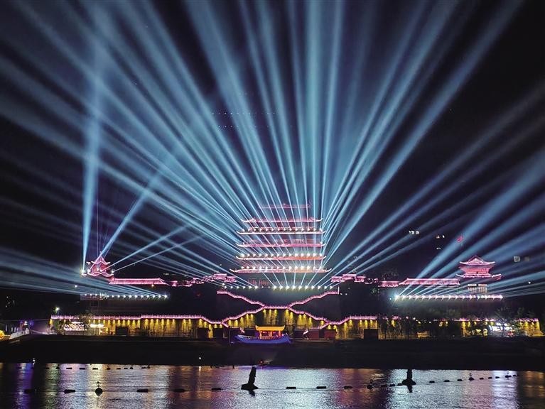 行约20分钟,便到达涉江楼水域。涉江楼上灯火辉煌,无数光柱从楼四周激射而出,照亮天空中的云彩。楼上传来声响,那是“5D灯光秀”剧目《涉江》正在演出。剧目讲述了战国时期楚国诗人屈原的故事,炫彩的灯光、悠扬的音乐、动人的讲述,让游客如痴如醉。