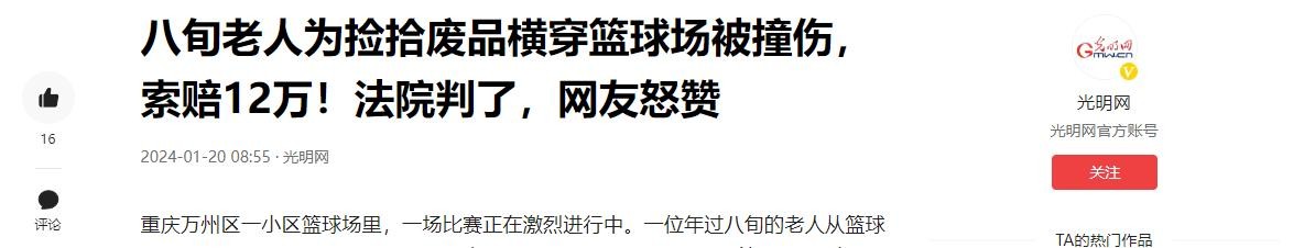 以上信源来自于光明网:八旬老人为捡拾废品横穿篮球场被撞伤,索赔12万!法院判了,网友怒赞