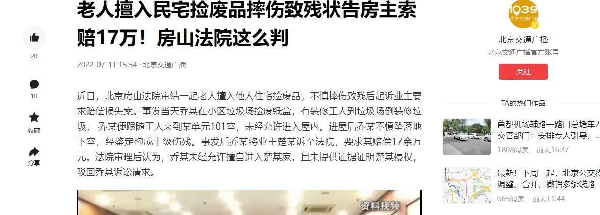 以上信源来自于北京交通广播:老人擅入民宅捡废品摔伤致残状告房主索赔17万!房山法院这么判