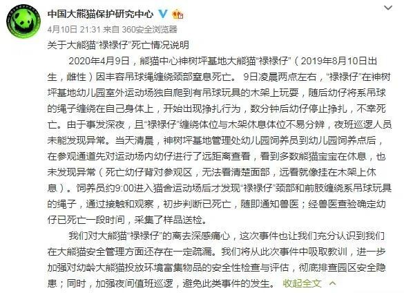 中国大熊猫保护研究中心10日通报,该中心神树坪基地大熊猫“禄禄仔”(2019年8月10日出生,雌性)因丰容吊球绳缠绕颈部而意外死亡。