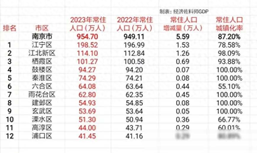 南京市12个市辖区(含江北新区)2023年常住人口数据及城镇