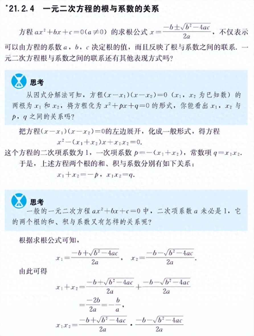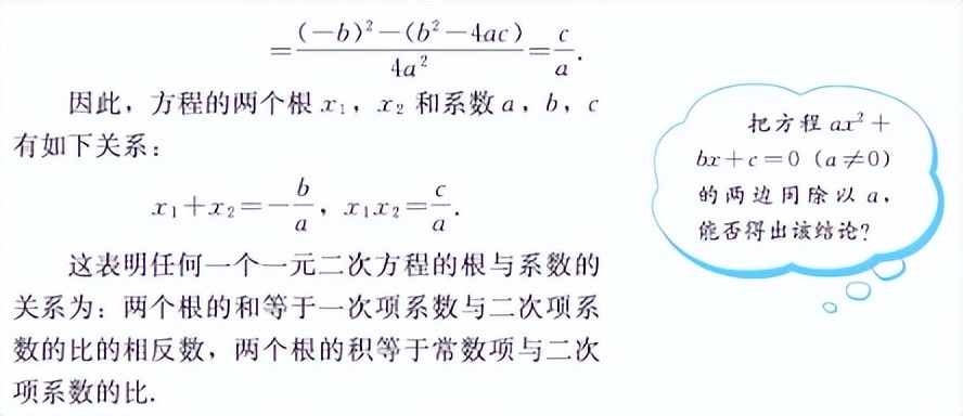 我们先看一下人教版教材中对于《一元二次方程的根与系数的关系》进行的总结和阐述: