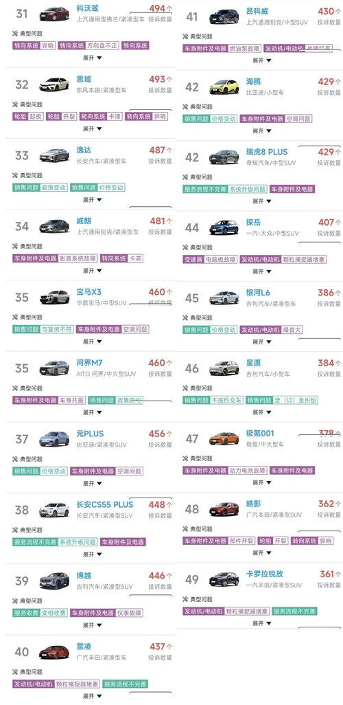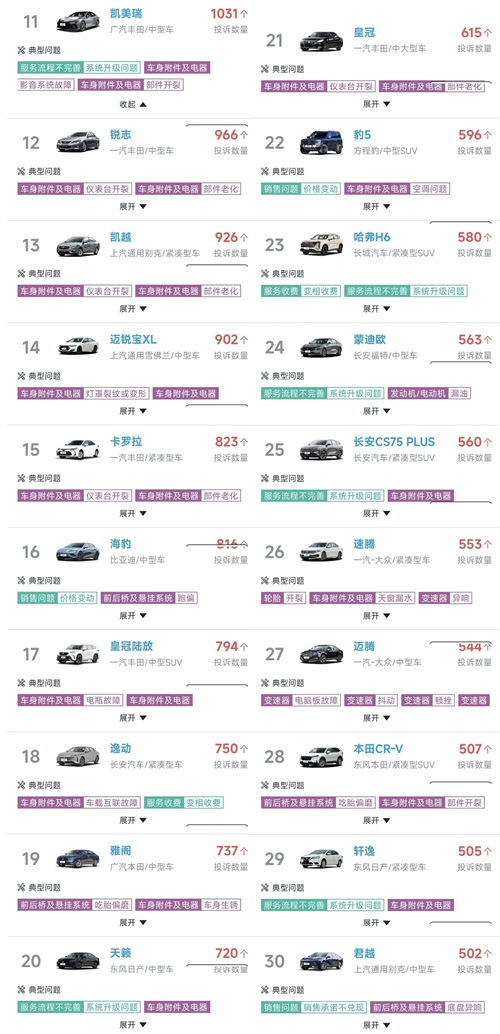 丰田旗下的锐志、卡罗拉、皇冠陆放和皇冠多款车型投诉排名靠前,其主要投诉是老车的仪表盘开裂问题,陆放则是电瓶故障。迈锐宝XL、雅阁、天籁、蒙迪欧和速腾等合资车型这次也未能幸免,特别是迈锐宝XL,其燃油泵故障和高位刹车灯断裂都是通病,而比亚迪旗下的海豹和豹5依旧逃不开降价被投诉。本田CR-V排名第28位,投诉数量为507个,典型问题是吃胎偏磨和部件开裂。