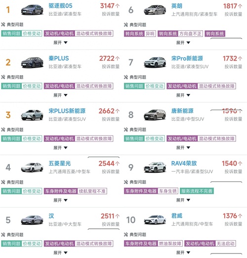 详细来看,投诉榜的前十名,投诉数量都超过了千例,投诉最多的是驱逐舰05,投诉数量达到了3147个,典型投诉问题就是价格变动和混动模式故障,这也是24年比亚迪旗下的车型被主要投诉的问题,此外,像秦PLUS、宋PLUS新能源、汉、宋Pro新能源和唐新能源都因为这两个问题被集中投诉,这次都进了榜单前十。英朗排名第6位,被投诉数量为1817个,也是2024年被投诉最多的合资轿车,其典型投诉是异响和方向盘不正。荣放、君威和凯美瑞这几款合资车型的投诉也超了千例,甚至荣放还因为车身生锈被集中投诉,君威则是通用旗下的通病,燃油泵故障。