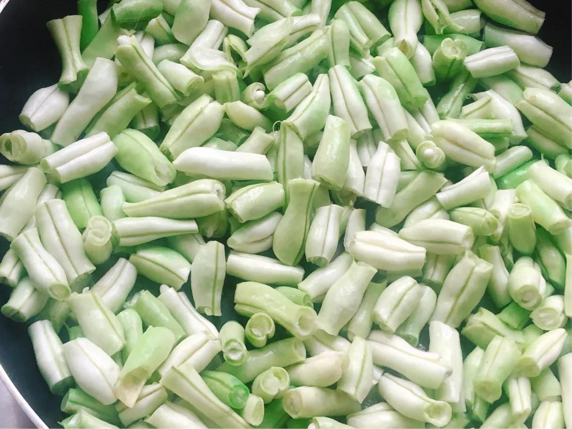 诀窍一,“白不老”以下就叫豆角,掐头去尾,扯掉两边的经丝,用手折成小节节而不是用刀切成小段。这样做一来能更加干净的扯掉经丝,二来能使豆荚里的每一粒豆子都保持完整。折完清洗干净控干水分。