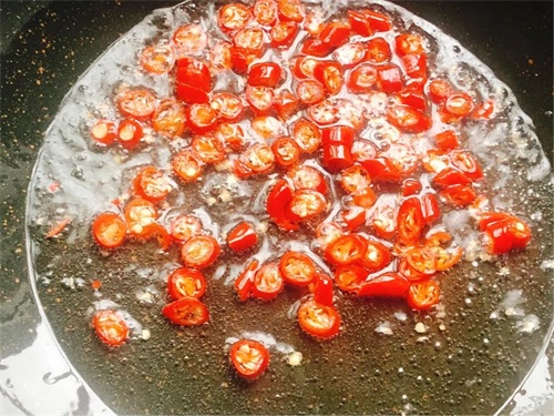 起锅烧油,倒入干辣椒炒香,我用的是小米辣,因为今天胃舒服了,又开始肆无忌惮的吃辣了。