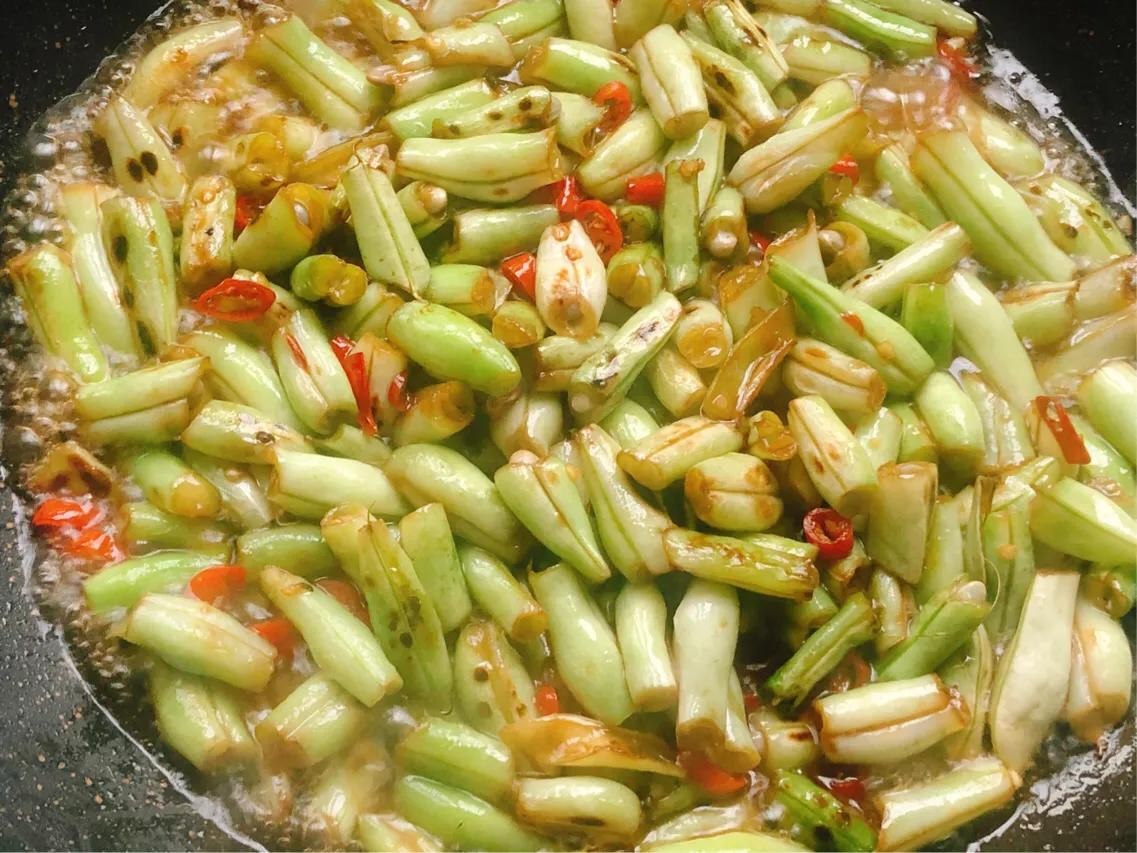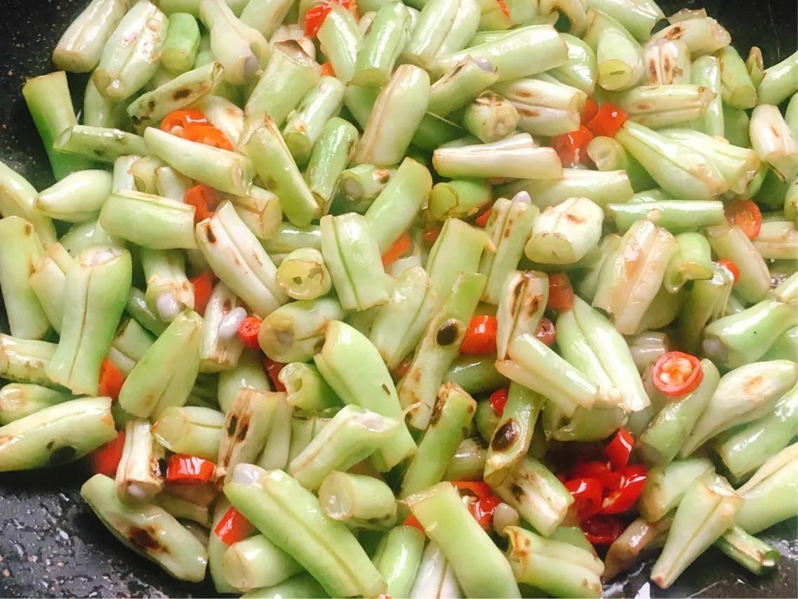翻炒片刻,倒入煸干水分的豆角,