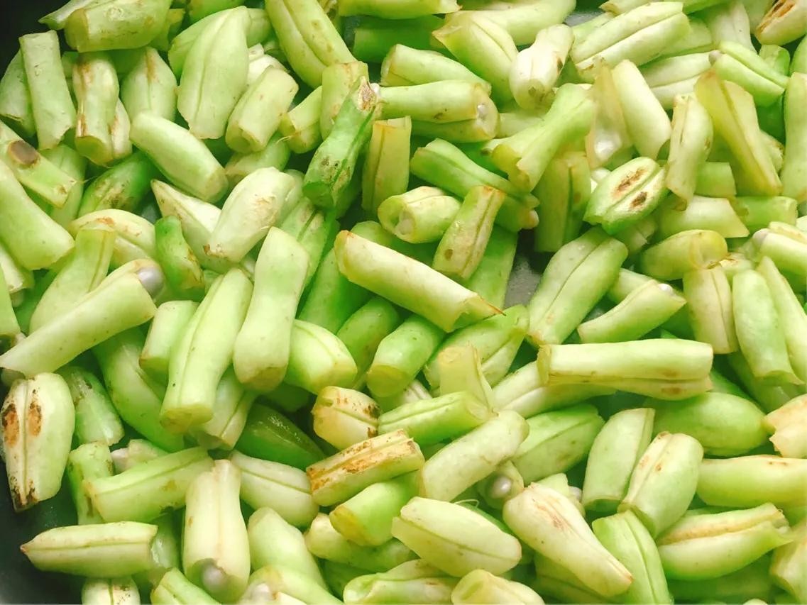 诀窍二,干锅煸炒,把豆荚里的水分逼出来,这样做的好处是为了后面红烧的时候更入味。干净的平底锅啥也不放,放入控干水分的豆角煸炒。