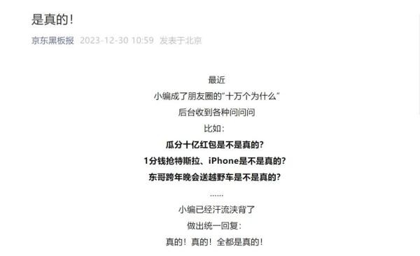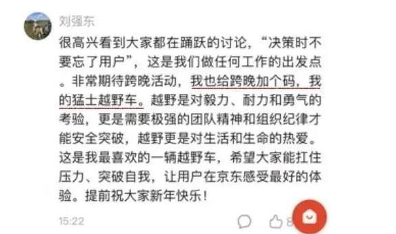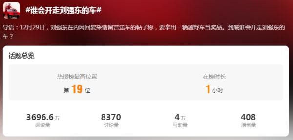 此外,据京东黑板报微信公众号2023年12月30日消息,京东在湖南卫视跨年晚会上送出“东风猛士越野车”的消息,引起网友热议关注,“谁会开走刘强东的车”话题也登上了网络热搜。