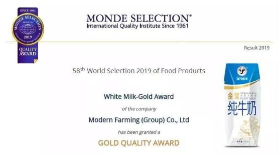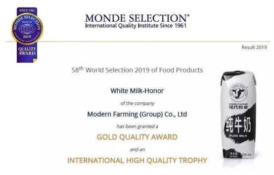 “Monde Selection”由欧洲共同体和比利时经贸部1961年共同创立,每年组织评奖。自2014年,现代牧业纯牛奶连续6年摘取大会金奖殊荣,2次捧得国际高质量奖杯。