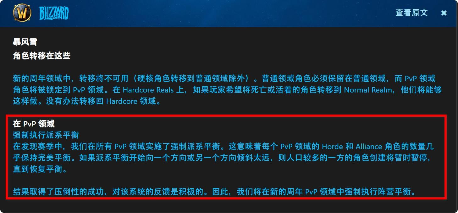 第二个阵营PVP的设定。我们都知道60级绝对是阵营PVP。最激烈的版本,这次暴雪的改动跟探索赛季一样,强制阵营平衡。两个阵营的比例最大不能超过55:45,如果超过这个比例,将会锁定人数多的阵营,只能够在人数少的阵营建角色,所以想建号的话要趁早。