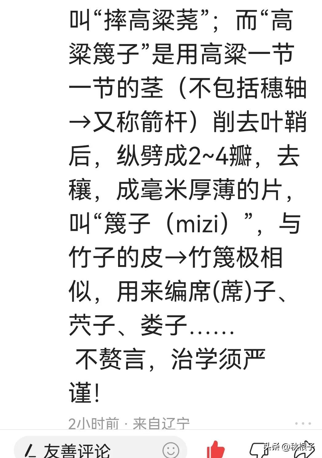 尔说的“高粱篾子(mí zi)”加上一个笤帚的配图,又错了:那也叫高粱荛。制刷帚、笤帚的高粱穗是摔着脱粒的,防穗被碾坏,所以叫“摔高粱荛”。而高粱篾子”是一节一节的茎(不包括穗轴——又称箭杆)削去叶鞘后,纵劈成2-4瓣,去穰,成毫米厚薄的片,叫“篾子(mí zi)”,与竹子的皮——竹篾极相似,用来编蓆(席)子、茓子、篓子……