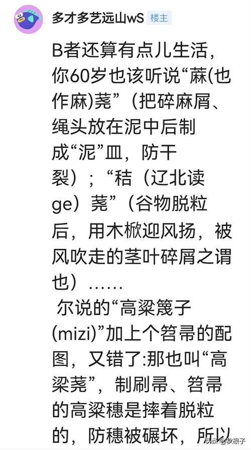 笔者还算有点生活。你六十岁,也该听说“蔴(麻)荛”,把碎蔴屑、绳头放在泥中制成泥皿,防干裂;秸(辽北读gē)荛,谷物脱粒后,用木掀迎风扬,被风吹走的茎叶细屑之谓也……