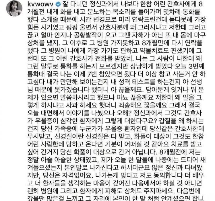 权珉娥在社交平台发文,抱怨精神科医院的护士没有同情心,表示自己已经去了很多精神科接受治疗,现在活得很辛苦,护士没有资格向她发火。言语间对护士的态度十分不满,同时也透露该护士的年龄比自己小非常多,认为护士对待她的态度已经是如此恶劣,那么其他年纪比护士小的普通患者,平常又该遭受怎样的语言暴力?