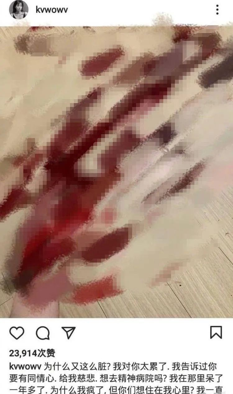 配图中,权珉娥貌似躺在地板上,手腕上有明显用刀割过的痕迹,周围流溅了很多的鲜血。大约一个小时之后,权珉娥删除了该条动态。