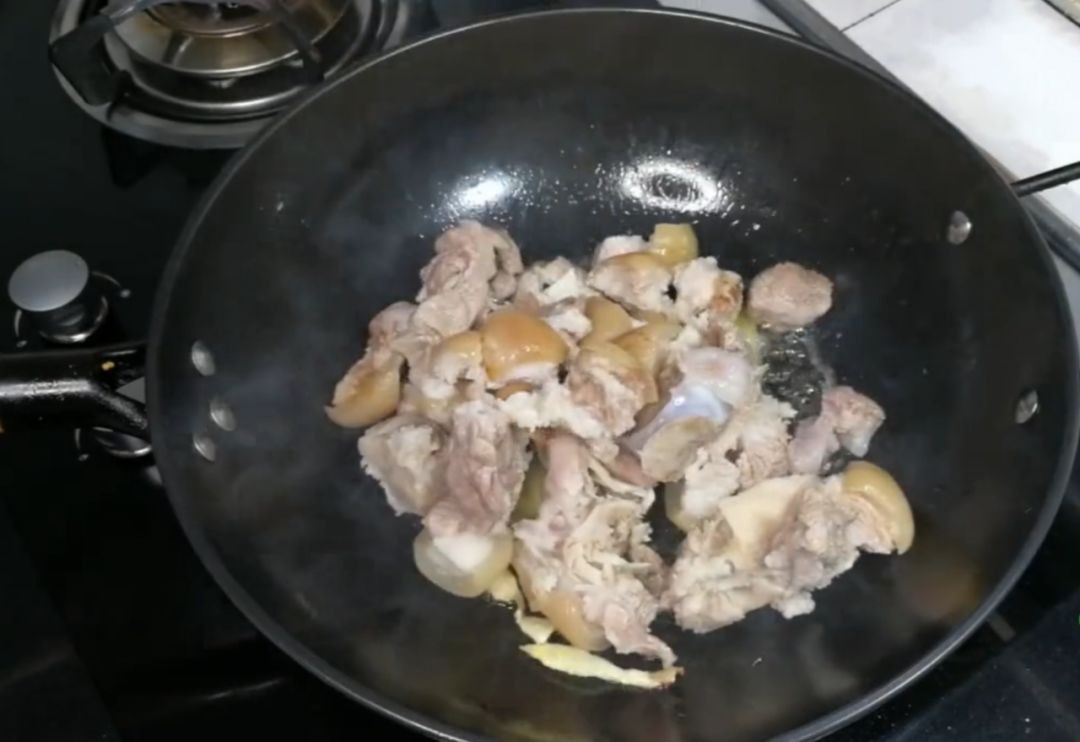 6.加适量盐,继续煸炒,将猪脚中的水分炒干。
