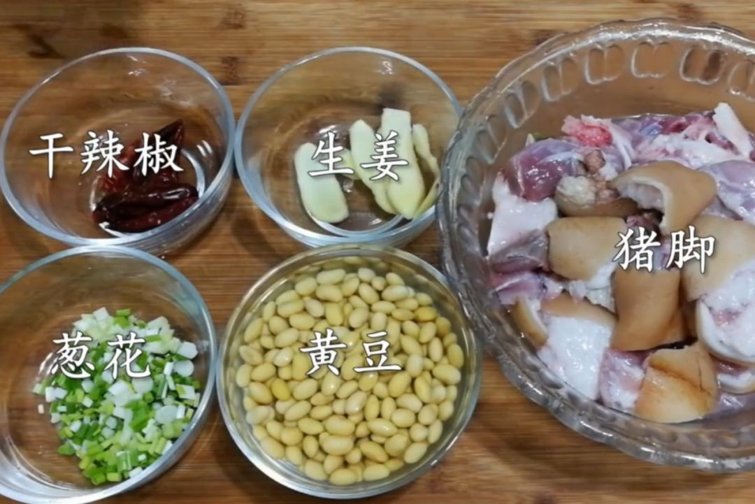 首先我们需要准备的食材有:猪脚、黄豆、生姜、干辣椒、香葱(适量即可,根据自己的食量和人数来确定食材)