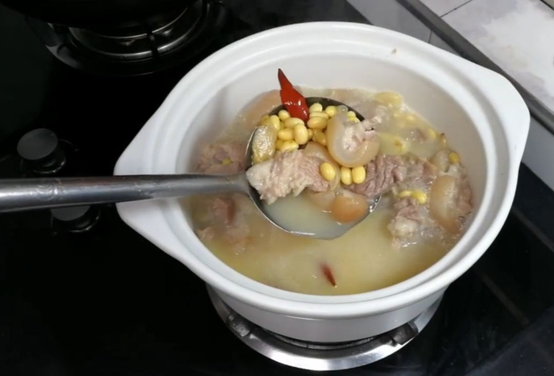 10.然后将浸泡好的黄豆下入砂锅中,盖上盖子再炖20分钟即可。