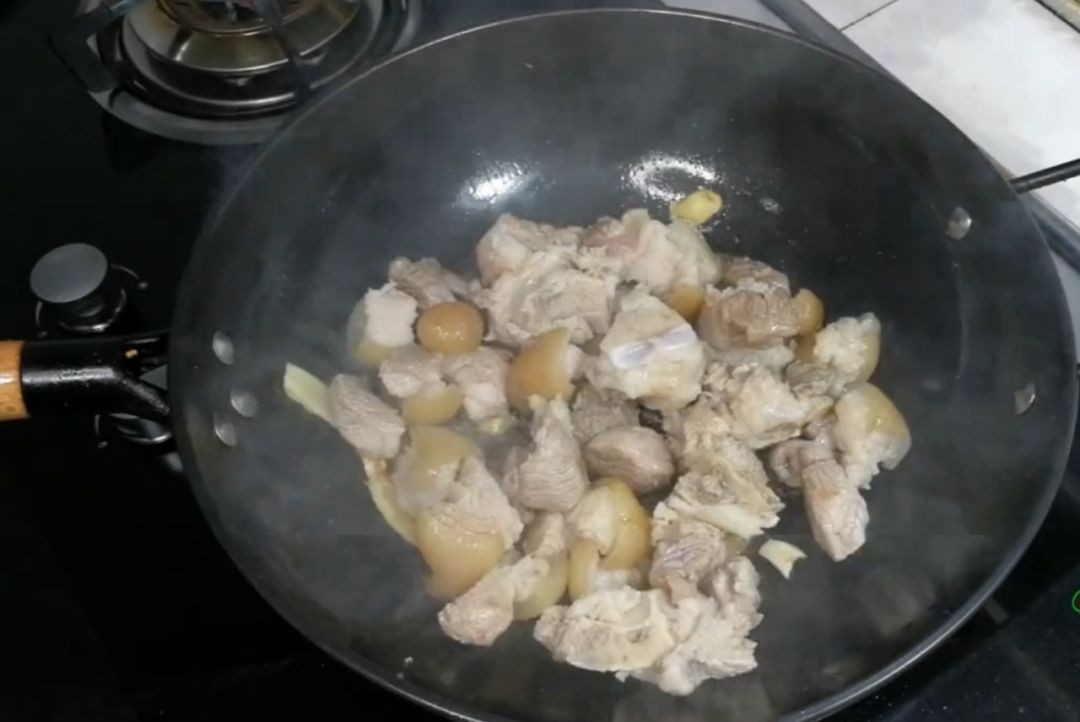 5.姜片爆香后下入沥干的猪脚大火煸炒一下,这样炖出的猪蹄汤更加醇厚雪白。