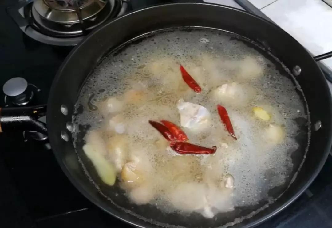7.然后倒入足量的清水,清水要能没过猪脚,再放入几个干辣椒,干辣椒能够去除猪脚的腥味,盖上锅盖开大火烧开,煮2分钟将汤煮白。
