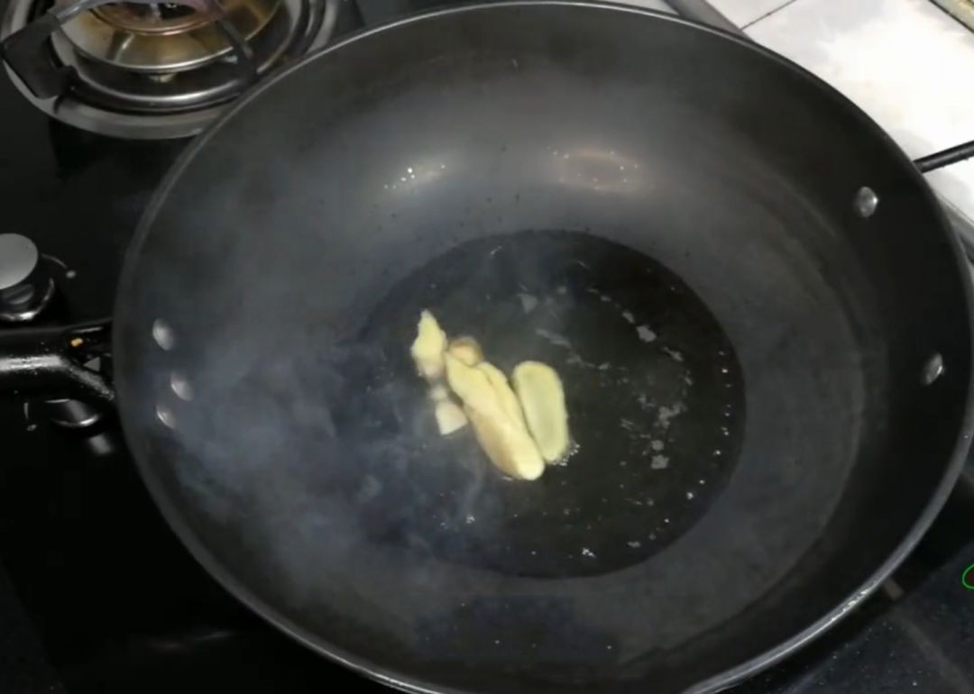 4.锅中倒入适量食用油,下入姜片先炒香。