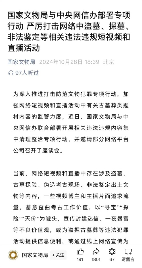 这不,国家文物局和中央网信办也看不下去了,联合发布新规,要加强对网络短视频和直播中涉及古墓葬等内容的监管。这无疑给网络鉴宝行业敲响了警钟,也让这个行业面临了新的挑战。