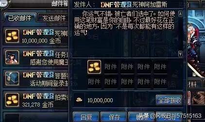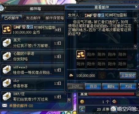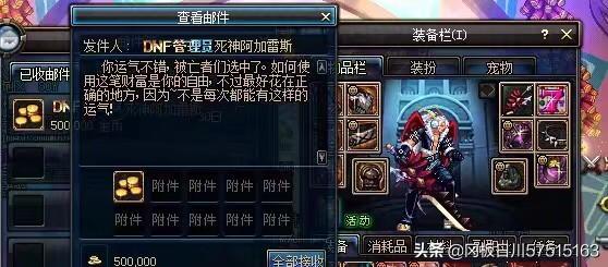 这个还真中过!70版本的时候了,那会晚上通宵无聊就去刷了一次,还跟朋友说如果中了请他喝红牛。第二天上线收到了邮件确实有一亿,这也是玩了几年dnf唯一一次欧皇的经历了!但一亿金币确实不够花,随随便便就用了,红包发了两三千万,抽娃娃机抽了近两千万,然后基本上是买票刷深渊了。85版本弃的坑。