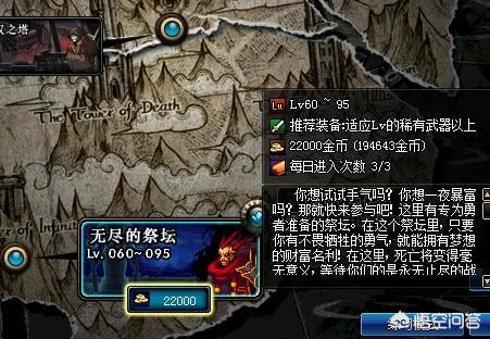 DNF有一个最让人向往的拼运气的地方“无尽的祭坛”。这个图刚出来的时候宣传的很火,因为最高奖励是一亿!当初的一亿和现在可不一样,那是我想都不敢想的一笔巨款,不夸张的说,如果我都是有一亿,我就是这条街最靓的仔!可惜从开始到现在我一次也没有中过。